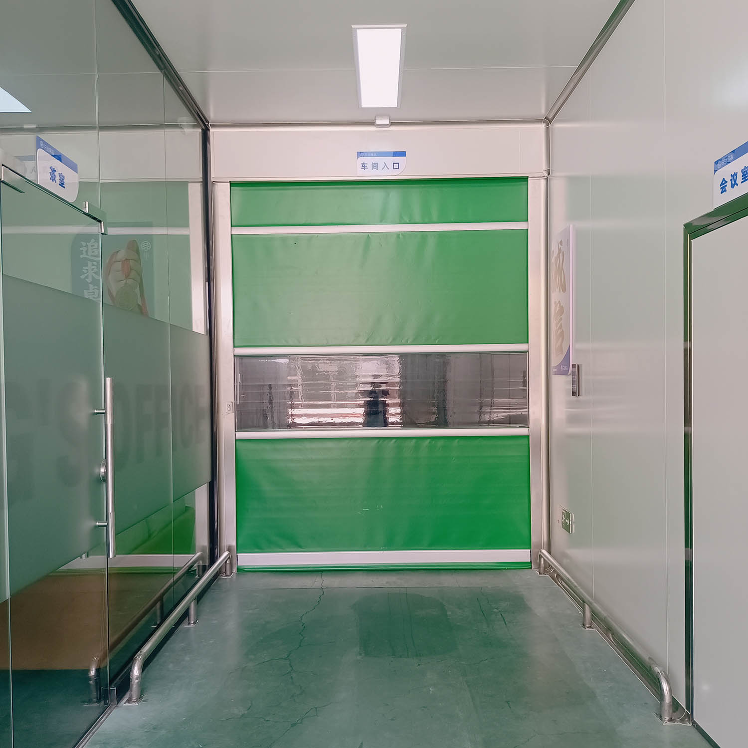 快速卷簾門的簾布可分段制作,每段高度約為700mm左右,各段簾布通過特制的鋁質抗風條聯接成一整體簾布,具有強度高、抗沖擊、不易刺穿等優點。此外,我們還可選用透明PVC材料制作簾布或部份選用透明PVC材料制作簾布,以便觀察軟簾門二側的情況,在簾布的底部設有鋁質底梁,及防撞軟袋簾布的頂部通過螺釘和壓條固定在卷筒上。